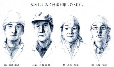 良質の水(硬水)が得られ、裏山の15m深の浅井戸からは口当たりの良い軟水が得られる。 これらを仕込み水、割り水に適材適所に使えるのが、この蔵の造りの特徴でもあります。 杜氏は蔵元でもある 三輪節雄氏、ご子息の三輪裕治氏が社長を務め酒造りにも携わり、その他二人の蔵人とともに