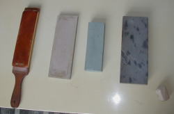 砥石 砥石には、天然砥石と人造砥石があります。理容刃物の研磨において、荒砥ぎとして人造砥石が用いられ、仕上げ、刃付け用としては天然砥石が用いられます。 天然砥石は、京都市右京区高尾梅ヶ畑一帯に産出する本山砥が有名です。最近はほとんど取れなくて、附近の山から産出したものを仕上げ砥としているそうです。価格は時価だそうです。(高そう〜) 人造砥石は、砥粒をボンドで結合して製造したものです。 ちなみに私が持っているのは人造砥石(多分¥2000くらい)です。 砥石には、荒砥ぎ用、中研ぎ用、仕上げ研ぎ用とあります。粒度は荒研ぎ用は#400程度で、中研ぎ用が#1000程度、仕上げ用が#6000程度のものをつかってください。 それから、大熊式では、はだか砥石を使用します。木の台が付いていると大熊式に乗りませんので、必ずはだか砥石を使ってください。