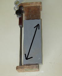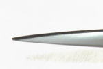 | 大熊式ハサミ研磨機の運行について では、研いでいきましょう。 ![]() 左手右手で持って、砥石の手前のときは刃先で、奥にいったときは刃元で、一回の動きで刃線のアールに合わせて一気に刃先から刃元を研ぎます。 濡れた砥面を見て刃の当たっているところを確認してください。右手のひじを上げれば刃先、ひじを下げれば刃元があたるようにして、どのくらいひじを上げれば刃先があたるか横から見て確認しておきましょう。右の画像のやじるしのところにハサミがあたるのがいいです。けっこう、S字になったりして均一に研ぐのは難しいので、慣れてくるまではゆっくりと研いでもらっていいですね。 ただやはり、一気に刃先から刃元まで研ぐのは慣れてこないと難しいと思いますので、分割して研いでいくといいです。私は刃線を6段階に分けて研いでます。 こちらのほうがおすすめです。↓↓↓ 私の研ぎ方 私は一気に研ぐと刃線がくるってしまいそうだったので、刃先、刃先から1センチ、2センチ、中間、中間のうしろ、刃元という具合に6段階くらいにわけて前後に動かしてました。 ![]() それも、ひじの上げ下げで調節するのではなく、体の姿勢で調節してました。 肩幅くらいに平行に立って、左足に体重をかけて刃先を、そのあと少し右に重心をずらしていって刃先から1センチ、もうちょっと右にずらして刃 先から2センチというように、体の姿勢で砥ぐ位置を決めてました。刃先の位置のときは体の位置はこのくらい、刃元のときはこのくらいでというふうにね。刃線を変えないで研ぐには、けっこうこれが重要だと思います。あとは、砥ぐときの圧力も重要です。これは、次のページの注意点のところで書きます。ただ、刃元はそんなに研がなくてもいいと思います。刃先と中間を中心に研いでいったほうがいいかな。 初めて研ぐハサミは、刃が何度なのかわからないので、刃にマジックを塗って角度の大きい方から4〜5回研いでみます。そうすると、砥石の当たっているところがマジックが削れますので、どのあたりが当たっているか分かります。これで刃線のところが当たっていればいいです。そうでなければ、少しずつ角度を変えて、何度のハサミか確認します。 ![]() 2段刃で荒砥ぎから仕上げる場合 1段目の刃を荒砥ぎします。角度は、35度〜40度。仕上がりの角度を45度にするため、それより少ない角度で始めます。動かす回数は40〜50回くらいですね。砥石にもよりますが、刃に返り刃が出ればいいです。荒砥ぎなのですぐに返り刃は分かると思います。 中砥に代えてください。荒砥ぎあとは、ハサミに荒砥で研いだスジがいっぱい入っているので、中砥に代えて、同じ角度で研ぎます。荒砥ぎのままだと、スジに水分が入ってサビの元になります。ただ、過剰な圧力は、返り刃が多く出てしまい、刃が荒くなってしまいます。 そのあと、返り刃をとるため、刃裏を研ぎます。 返り刃の取り方は、角度調節金具を立てておいて、ネジ穴を右手人差し指で押さえて、1センチくらいの前後の細かい動きをします。突き研ぎです。左手はハサミの中間の刃線側を押さえます。数回研ぐと砥面にハサミの黒いあとがでます。これでいいです。返り刃が無くなっているのを確認してください。(右の写真では、白い線で書きました。こんな形の黒い跡がでればいいですね。ただ、やりすぎないように。2段目を研ぎます。 角度を45度に変えて、細かい糸刃を作ります。 砥石は中砥のままで、回数は5回くらい。裏を2、3回研ぎます。 ここまでで、2段刃のもとができました。 あとは、仕上げです。糸刃を仕上げて切れ刃をつくっていきます。 仕上げ砥石に代えて、角度はそのまま。力を入れないで軽く、回数は砥石によってかわりますけど、軽く全体に30回くらい、そのあと、刃先をメインに30回くらい研ぎます。それから、裏を5回、表に戻して2、3回、最後に裏1回。 これで、大体研ぐことが出来たと思います。 最後に、爪で確認。確認方法は、左手の親指の爪にハサミの刃を当てて、ス〜っと引いてみてください。刃がツルっとした状態になってると思います。コツコツやザラッとしていると、まだ返り刃がでています。返り刃をちゃんと取っておいてください。 この返り刃が取れてないと、はじめはそれなりに切れてるのですが、すぐ切れなくなってしまいます。 次は、「注意点・その他」です。 |